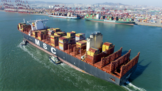 1月27日,一艘集装箱货轮缓缓驶入青岛港前湾集装箱码头(无人机照片)。新华社记者 李紫恒 摄
